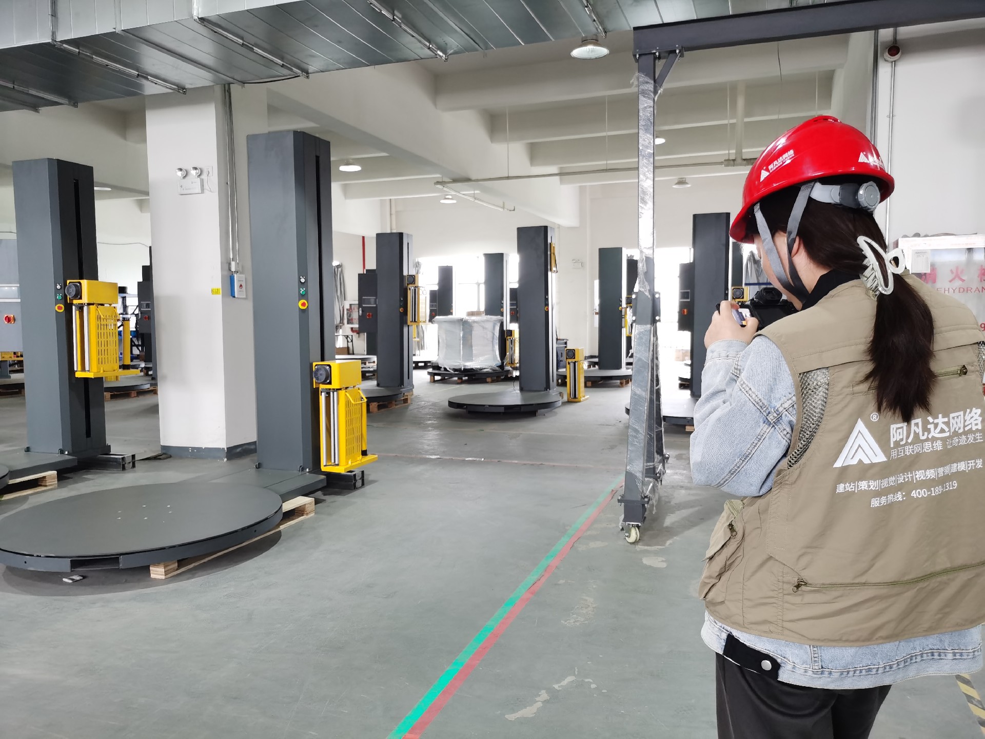 二樓會議室里,雙方就標準化產品的電商呈現策略展開深度溝通。不同于非標設備的定制化展示,此次拍攝需突出產品的通用性、易用性及核心性能參數。帶著明確的創作框架,團隊來到三樓成品倉庫。幾十臺臺銀灰色標準化纏繞機整齊列陣,金屬機身在專業燈光下泛著科技質感,控制面板的數字化界面、自動感應的膜架等細節被逐一捕捉。