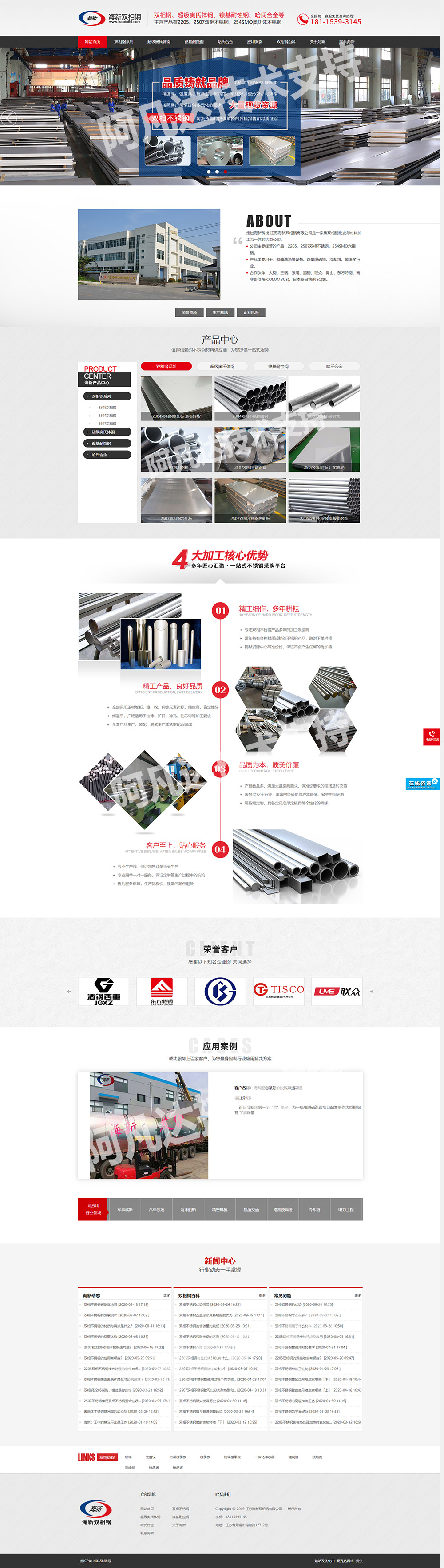 【公司簡介】:1.江蘇海新雙相鋼有限公司是一家集雙相鋼批發(fā)與材料加工為一體的大型公司。公司主要經(jīng)營的產(chǎn)品:2205、2507雙相不銹鋼,254SMO六鉬鋼。